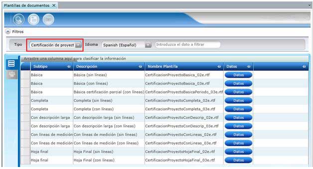 Una vez dentro del formulario de Plantillas de documentos deberemos seleccionar el Tipo Certificación de Proyecto.