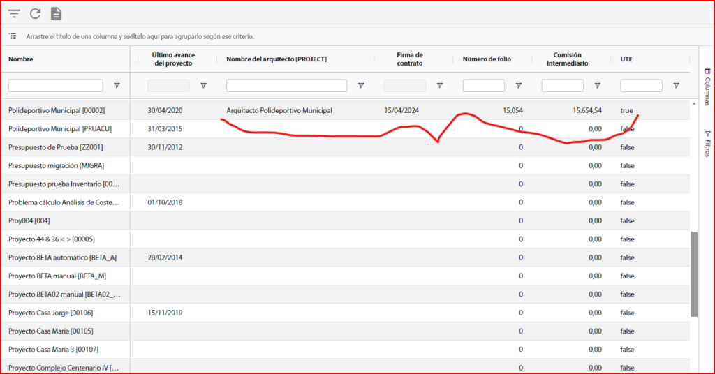 Además cuando se lanza el informe de Proyectos desde el módulo “Análisis de Datos”, también se agregan dichas Propiedades Personalizadas en las últimas columnas a la derecha, también con el tipo de dato y el orden determinado en la configuración.