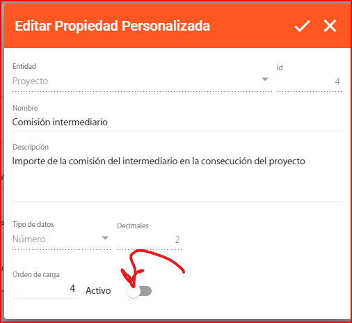 Si en algún caso se desea deshabilitar una propiedad, bastará con ir la pantalla de las configuraciones generales, seleccionar la propiedad y marcar el botón de desactivado
